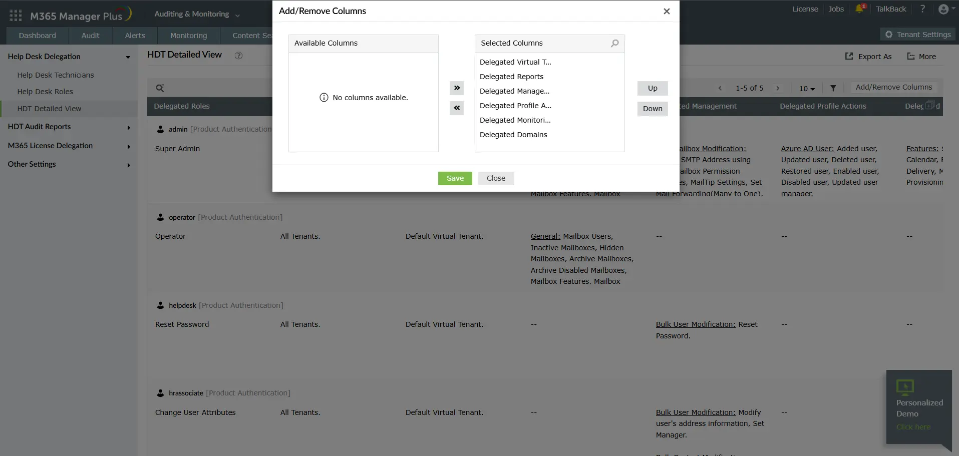 Cree roles personalizados para delegar tareas a usuarios no administrativos, como técnicos de la mesa de ayuda o asociados de RR. HH., para reducir la carga de trabajo de los administradores principales.